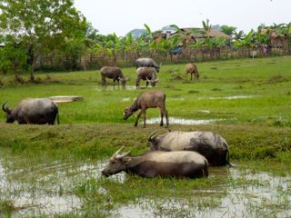pleine campagne; nous y observons des buffles d’eau brouter à demi immergés.